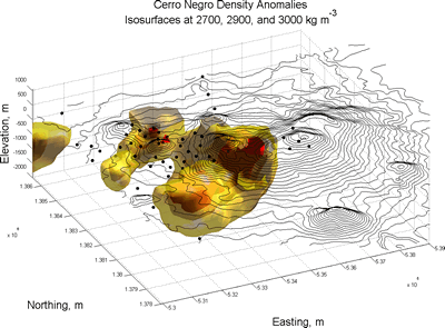The answer I found pointed to a bit of both. With my co-authors, I measured small changes in gravity on and around Cerro Negro and neighboring volcanic cones, and inverted the gravity measurements to construct a 3-D model of the density changes underneath the volcano. The model showed high density anomalies, that I interpreted as cooled magma, connecting Cerro Negro and its neighbors Las Pilas-El Hoyo and Cerro La Mula. I deduced that Cerro Negro represented the latest cone in a large volcanic complex – a small feature tapping a larger magma system. My research suggests that Cerro Negro and its sibling volcanoes are here to stay, and well worth keeping an eye on!