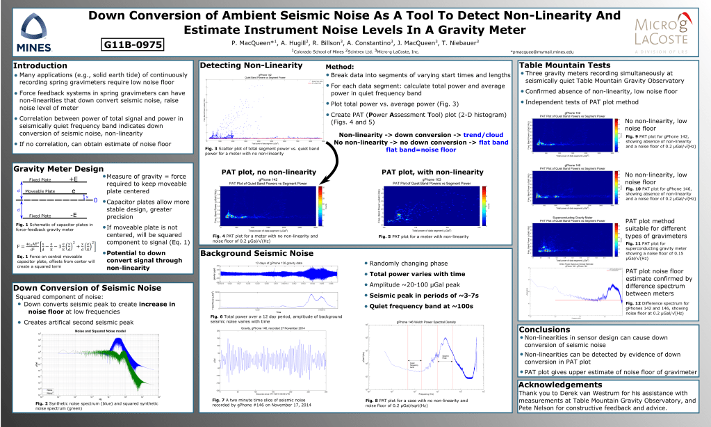 MacQueen, P., Hugill, A., Billson, R., Constantino, A., MacQueen, J., Niebauer, T. (2015). Down Conversion of Ambient Seismic Noise As A Tool To Detect Non-Linearity And Estimate Instrument Noise Levels In A Gravity Meter. Abstract G11B-0975. 2015 AGU Fall Meeting. (Outstanding Student Presentation Award)