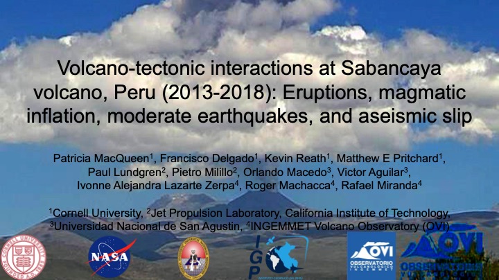 - MacQueen, P., Delgado, F., Reath, K., Pritchard, M., Bagnardi, M., Milillo, P., Lundgren, P., Macedo, O., Aguilar, V., Zerpa, I., Machacca, R., Miranda, R. (2019). Volcano-tectonic interactions at Sabancaya volcano, Peru: Eruptions, magmatic inflation, moderate earthquakes, and aseismic slip. 2019 EUROVOLC Etna Summer School on Sub-Surface Volcanic Processes.
